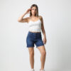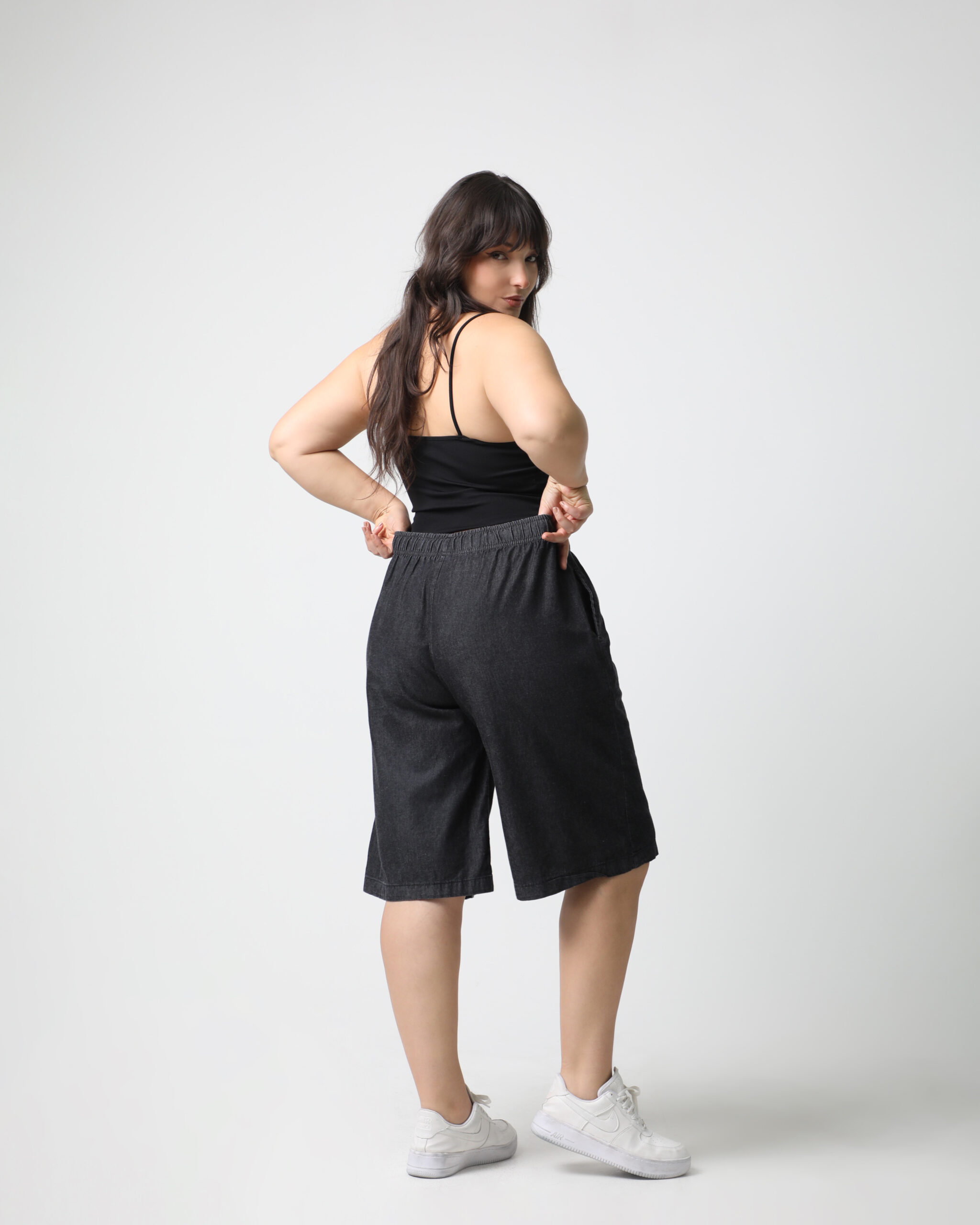 Color: Negro. La modelo viste: Talle 48. Largo de la entrepierna: 45 cm (36 al 44) 45 cm (46 al 60) Modelo: Short. Altura de la cintura: Alta. Bolsillos: tiene 2 bolsillos funcionales delanteros. Material: Jean. Cierre: Elastico con cordon de algodon.