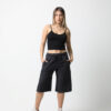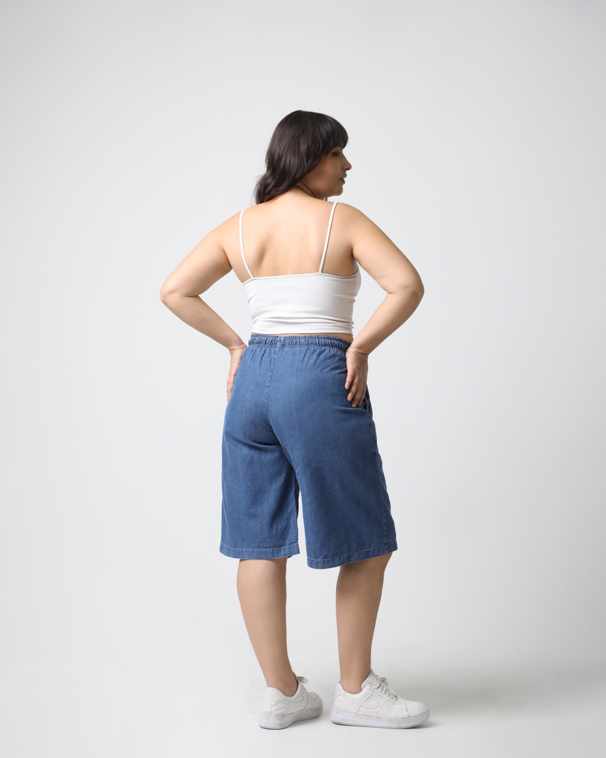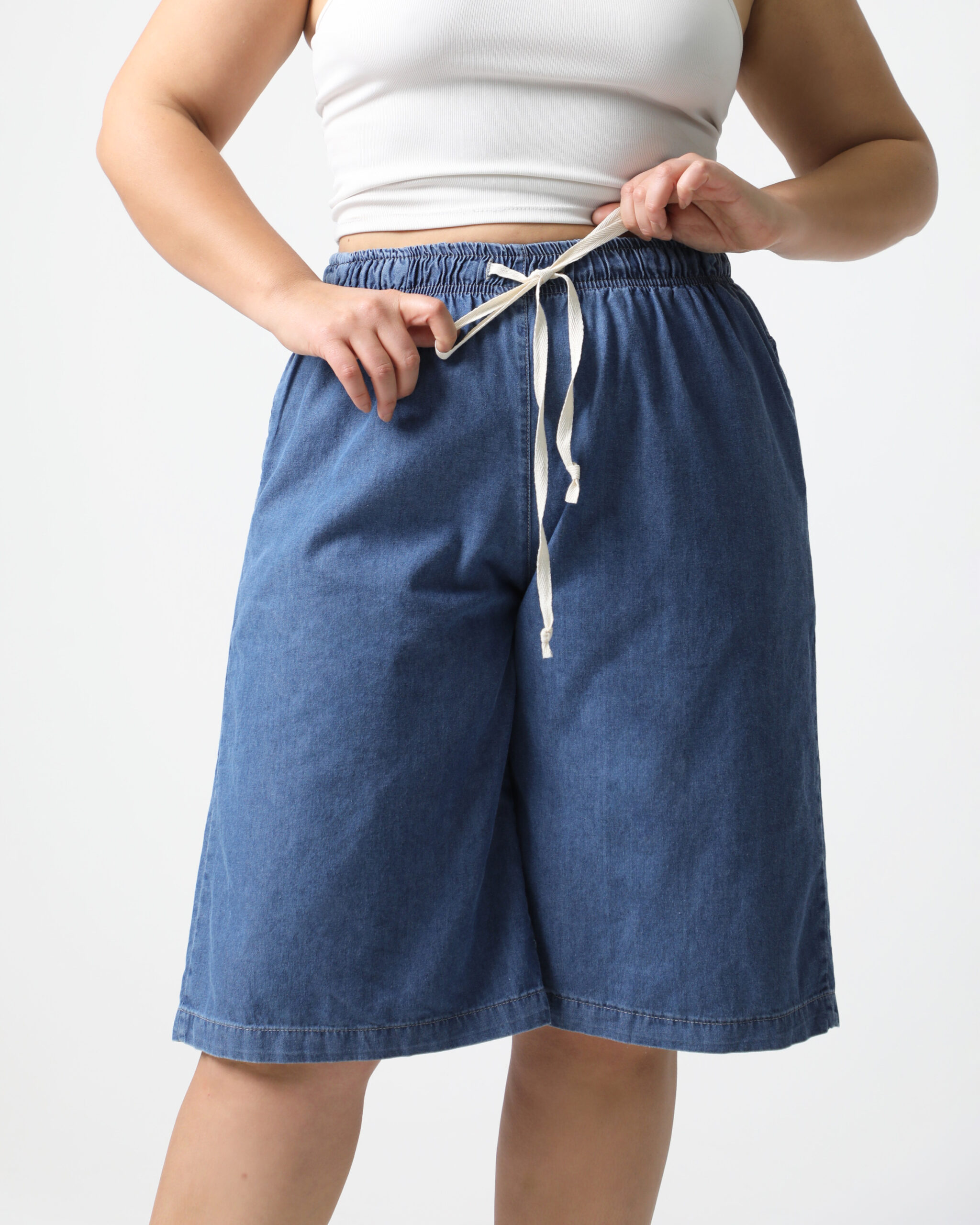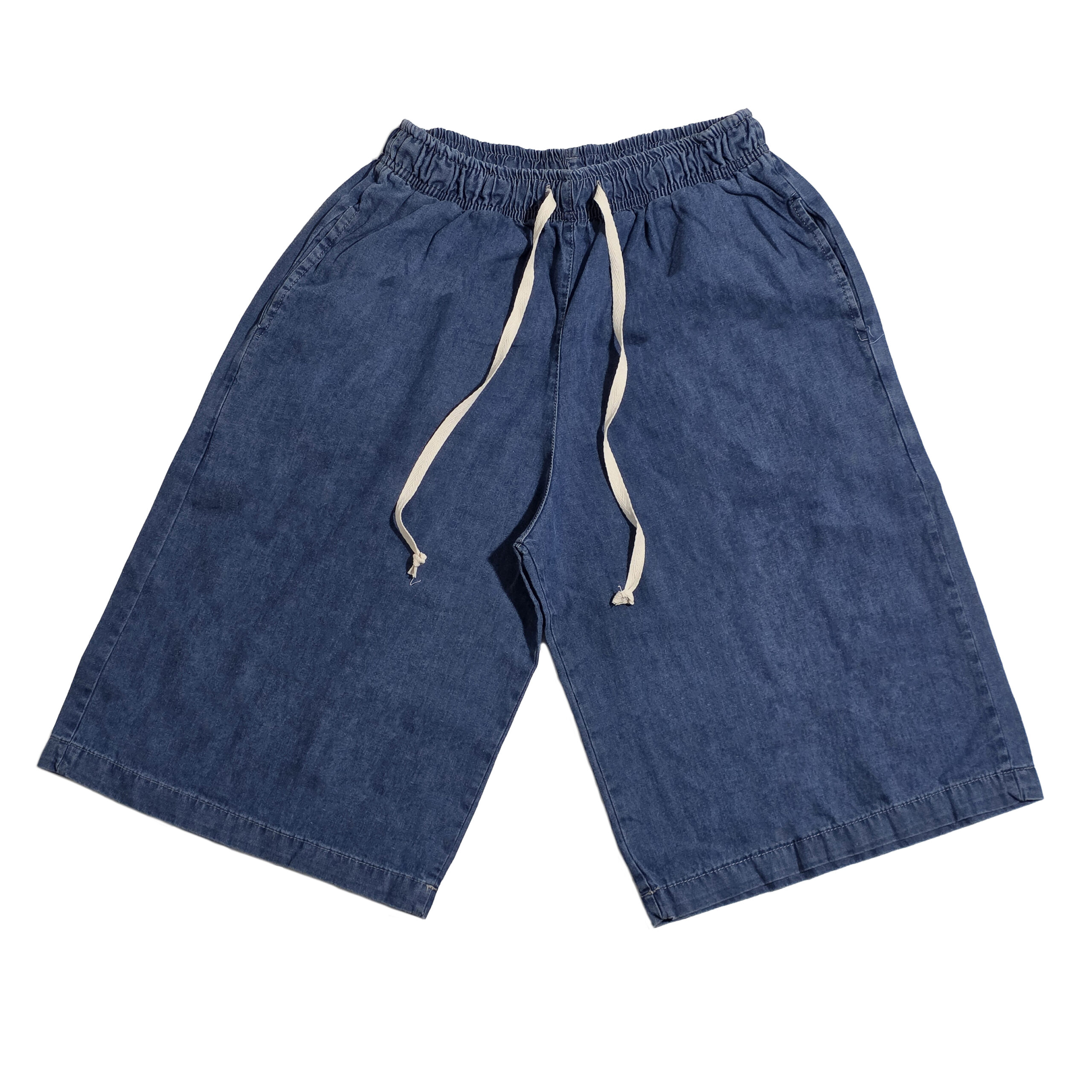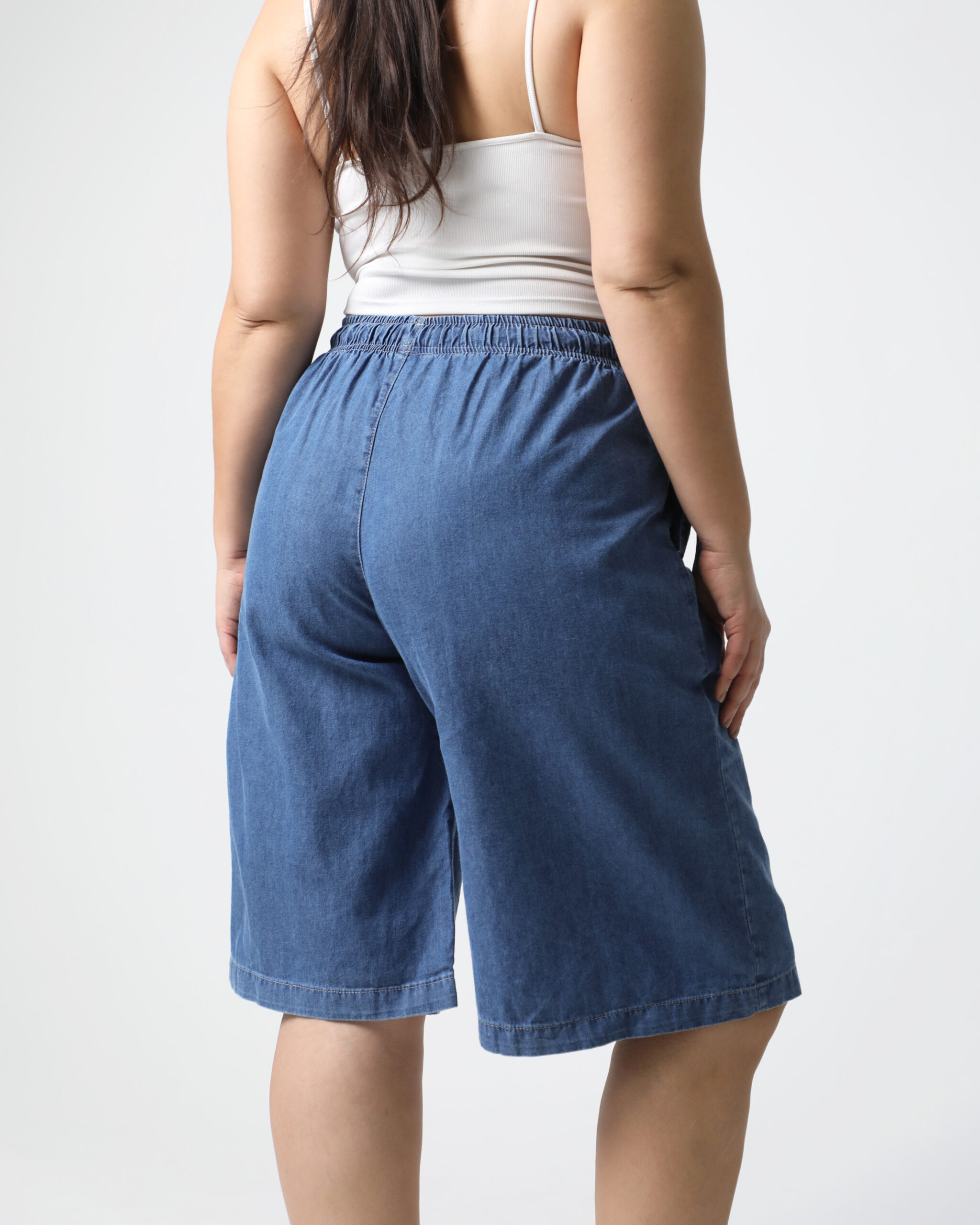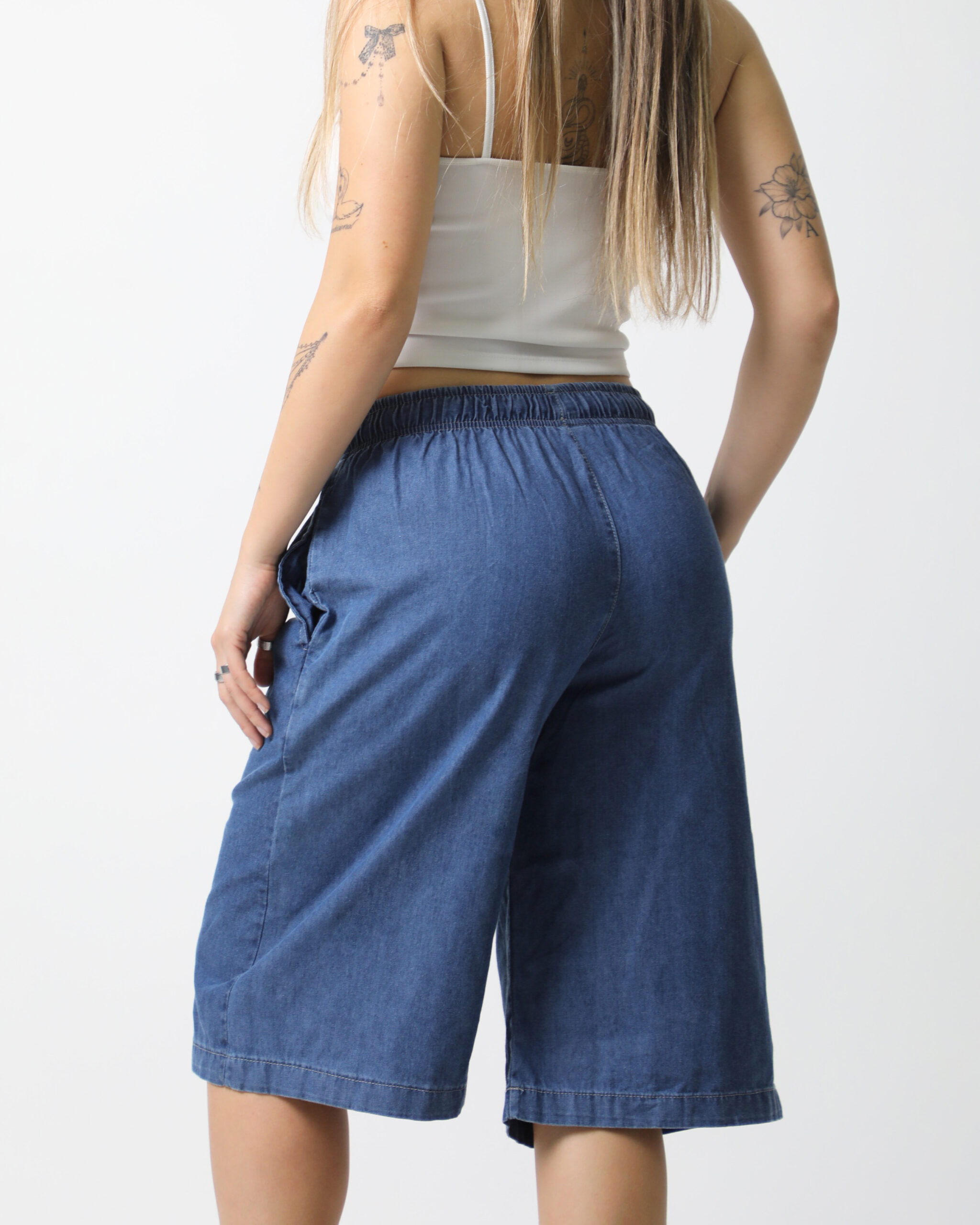Color: Azul. La modelo viste: Talle 48.Largo de la entrepierna: 45 cm (36 al 44) 45 cm (46 al 60) Modelo: Short. Altura de la cintura: Alta. Bolsillos: tiene 2 bolsillos funcionales delanteros. Material: Jean. Cierre: Elastico con cordon de algodon.